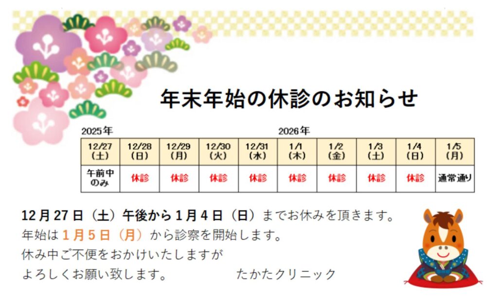 年末年始の休診のお知らせ 2025年12月4日 最終更新日時 : 2025年12月4日 yutak031 年末年始の診察時間のお知らせをいたします。 2025年12月27日(土)午前中 受付午前11:45まで 2025年12月28日(日)~2026年1月4日(日) 休診 2026年1月5日(月)から診察いたします。 お休み中、ご不便をおかけいたしますが 何卒よろしくお願い致します。 診療時間外の緊急の場合は「050-7107-0940」までご連絡ください。 Follow me!